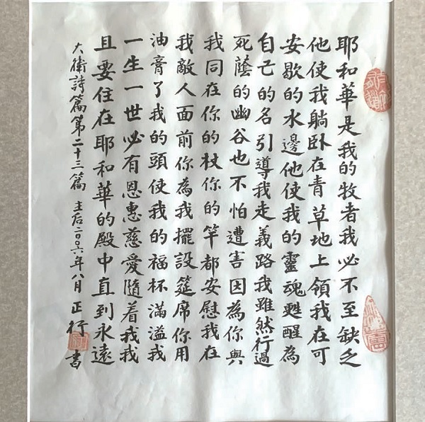 ▲Brother Zhengxing’s favorite calligraphy works on the 23rd Psalm.