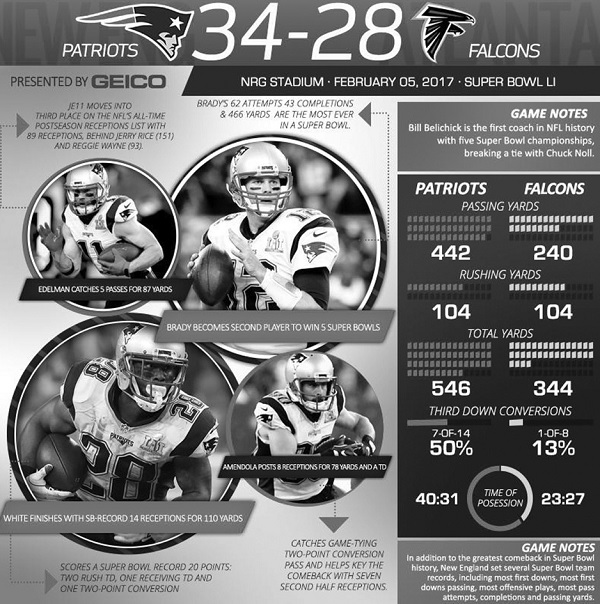 ▲2017年美式足球超級盃冠軍賽,老鷹隊(Falcons)和愛國者隊(Patriots)爭奪冠軍。