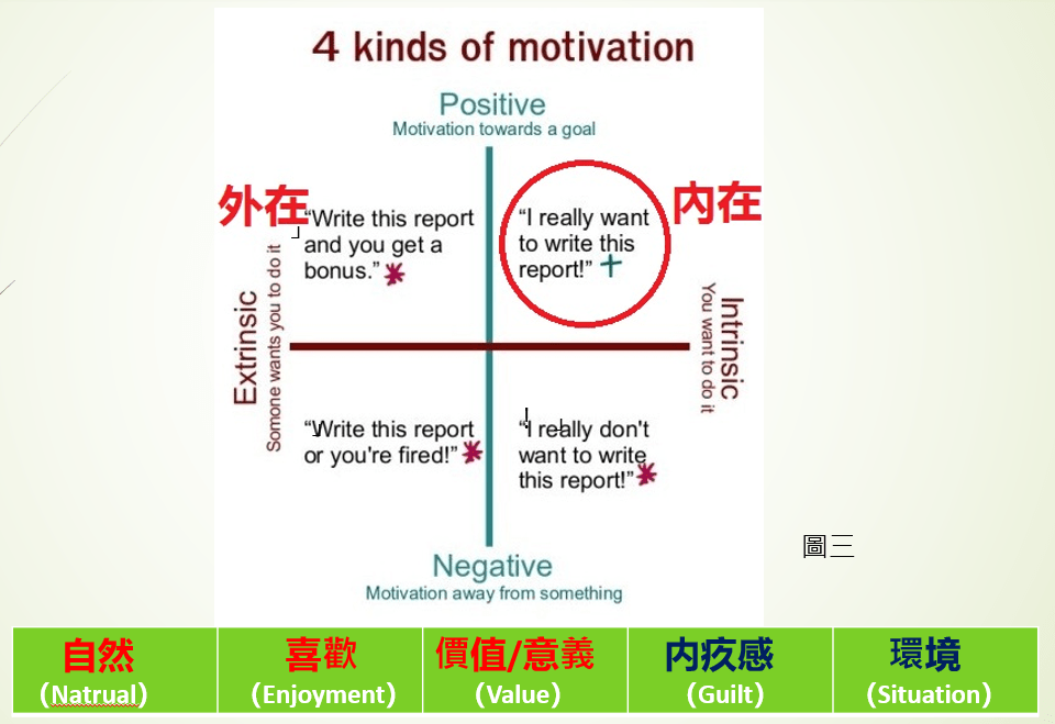 Building on this four-quadrant framework, motivation can be further divided into five categories: 1. Nature; 2. Interest; 3. Value / Sense of meaning; 4. Guilt; 5. Environment. The first three are positive drivers, while the latter two are negative drivers.