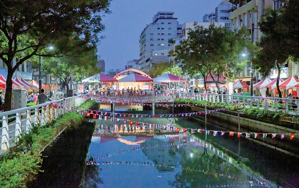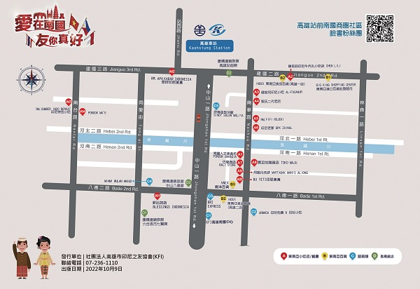The advertising board on the outer wall of the triangular window store depicts the unique scenery of Indonesia, Thailand, Vietnam, and the Philippines. A map hangs on the beams of the arcade - Jianguo Road and Bade Road are the boundaries to the north and south, and Linsen Road and Nantai Road are the east and west boundaries. Between them, the "Kaohsiung Nanguo Business District" is designated, welcoming immigrants from Southeast Asia as if they have returned home; it also calls on locals to "fake going abroad" and experience the Southeast Asian style.