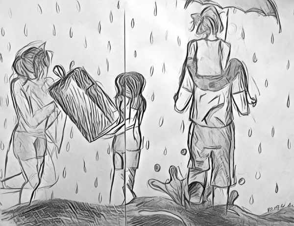 It was pitch dark outside, and when I opened the door, it was pouring with rain. Looking down at the water overflowing in front of the door, a flashlight shone in the distance and it was Kenny walking toward us, or rather swimming, in the water with one foot deep and one foot shallow. No matter what I said, I held my third child, my husband held my second child, and Kenny held my luggage. I took one last quick look at the messy house, held back my tears, and plunged into the rain.