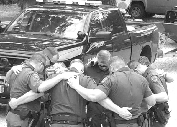 ▲Louisiana wildlife and fisheries workers pray together before going to Texas to provide rescue. Photo credit: Scott Mathews’ Facebook.