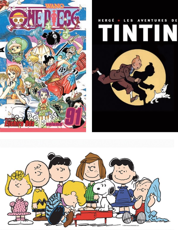 ▲漫畫具個性化魅力,因此從日漫《海賊王》(左上),到法國《丁丁歷險記》(右上),到北美《史努比》(下)⋯⋯,都有死忠粉絲。