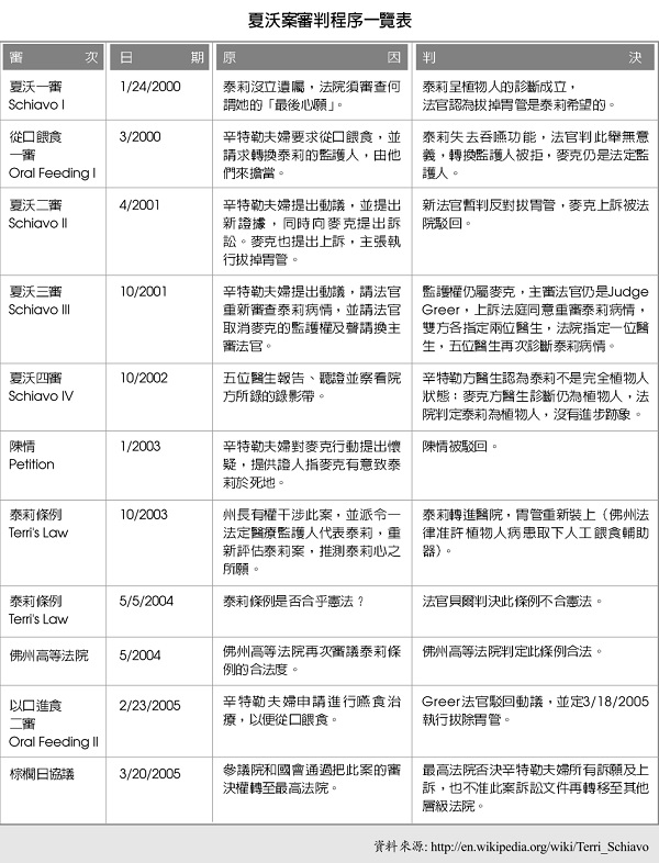 Various reasons, such as: What is the definition of vegetative state? The gap between medical and legal definitions; various medical policies, doctors insisting on different diagnoses... etc. Therefore, the court must hold a hearing to decide what kind of arrangement is closest to her personal wishes. From then on, a series of court review proceedings began that lasted for more than ten years [please refer to the "Schiavo Trial Procedure List" on page 30]. Finally, the court ruled to allow Mike’s application: to remove Terry’s stomach tube!